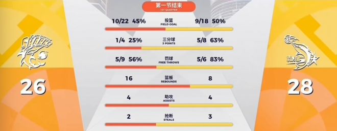上海男篮17-26落后9分时,卢伟紧急叫了暂停。回来后,大鲨鱼状态明显回升打了一波6-0。首节还剩最后一攻,随着弗格三分命中,比分定格在26-28。