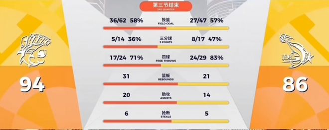 再次回到场上,上半场发挥神勇的“小胖”在一次对抗中手指受伤离场,好在其他人都没有掉链子,里突外投帮助大鲨鱼继续扩大优势。第三节比赛结束,上海男篮94-86领先福建男篮