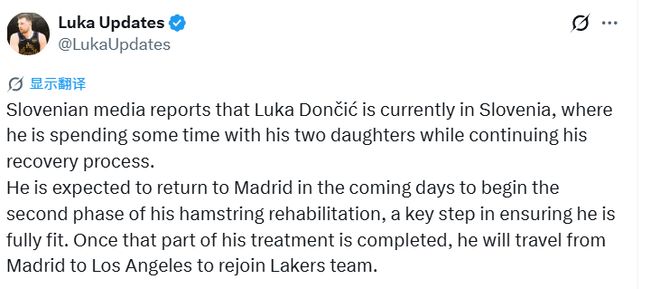 在斯洛文尼亚短暂休整后,东契奇很快将重返马德里,进行下一阶段的治疗。之后,他将从西班牙首都飞回洛杉矶,在那里与湖人会合。
