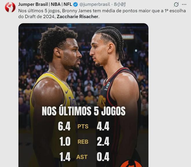 北京时间4月12日,媒体晒出老鹰状元里萨谢和湖人55号秀布朗尼最近5场的数据。里萨谢场均出战13.6分钟,得到4.4分2.4篮板0.4助攻0.8抢断,三分命中率30%。布朗尼场均出战16.8分钟,得到6.4分1篮板1.4助攻0.8抢断,三分命中率35.3%。