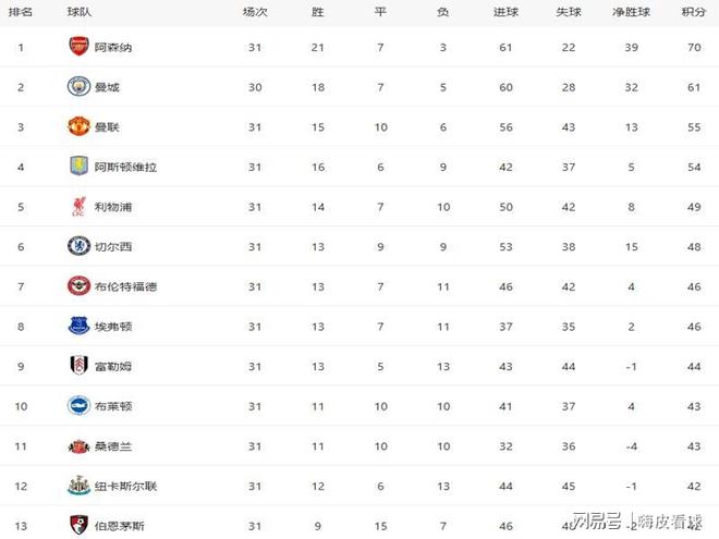 因此,从英超积分榜来看,阿森纳得到70分,比第六名多出22分,剩余7轮情况下,成为第一支锁定欧冠资格的球队。少赛一场的曼城得到61分,欧冠资格也是没有悬念的。